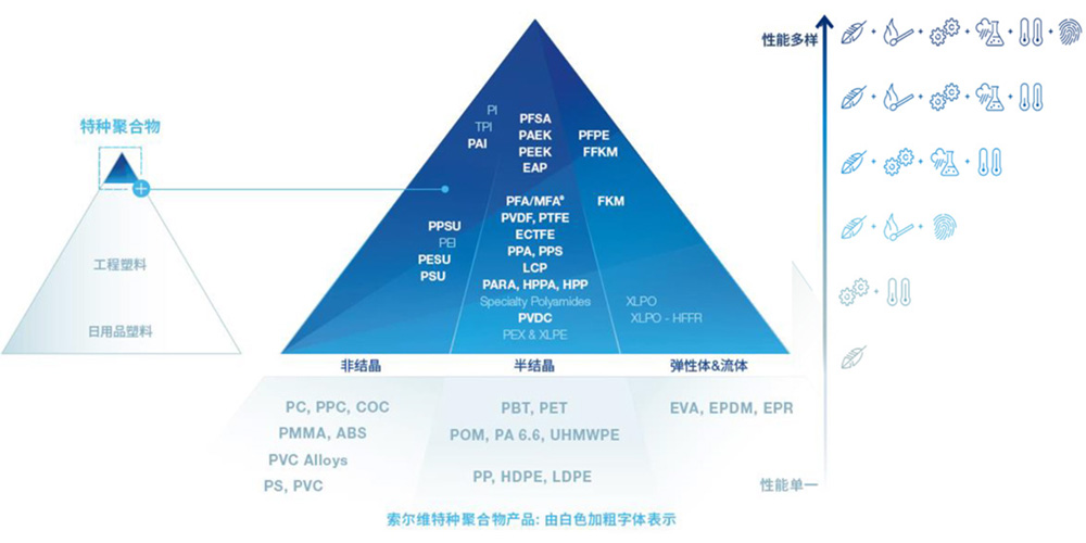 世索科特种聚合物事业部向市场提供35种品牌、1500多只高性能聚合物产品,涵盖氟聚合物、氟橡胶、氟化液、半芳族聚酰胺、砜类聚合物、芳香族超高性能聚合物、高阻隔性聚合物和交联型高性能化合物,广泛用于航空、可替代能源、汽车、医疗、膜、石油与天然气、包装、管道、半导体、电线电缆等其它市场。