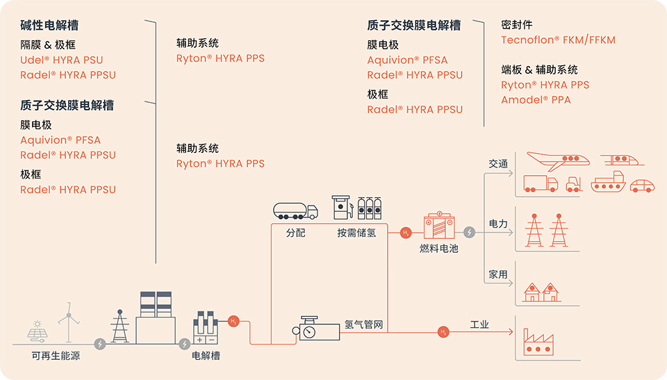 世索科 是全球少数几家能够提供高度先进材料的公司之一,这些材料包括用于生产和利用氢气所必需的超薄薄膜离聚物和轻量化、且耐受性高的聚砜类聚合物。 我们的绿氢平台整合了所有相关解决方案和能力,增强了我们为各行业客户提供服务和建议的能力。我们的解决方案覆盖:
