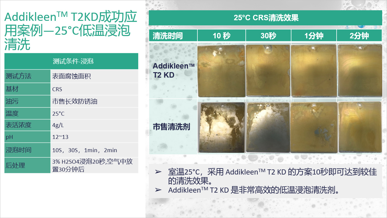 Addikleen™ T2KD甚至在室温浸泡清洗的情况下也表现出了极其优异的清洗力,清洗效果远超市售清洗剂。