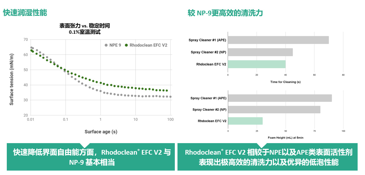 Rhodoclean™ EFC V2 也同样展现出了低温下相较NP系列产品更优异的清洗效率及卓越的低泡性能。同时Rhodoclean EFC V2 作为基于松油衍生物制备的植物基天然原材料产品,也拥有良好的生物降解性能 (>60% 28 天后 – OECD 301F)。